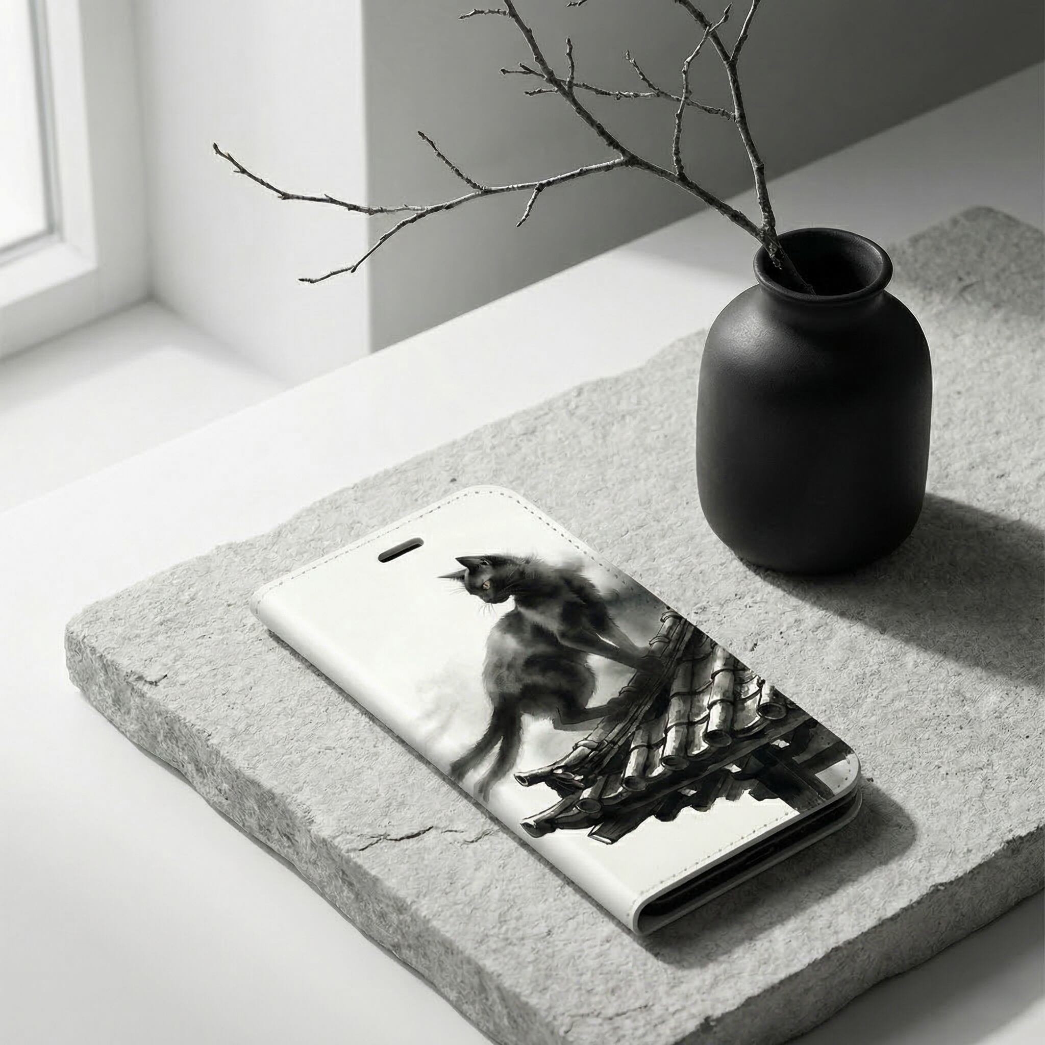 iPhone対応 スマホ 手帳型ケース 墨絵 猫又 幽玄 三日月 妖怪 黒猫 和柄 水墨画 浮世絵 渋い 和風 水墨画 アート モノトーン クール 和モダン スマホケース スタンド Sumi-e Silhouette Art 【iPhone17 / iPhone16e / iPhone16 他 iPhone各機種対応】 |iajpnk02