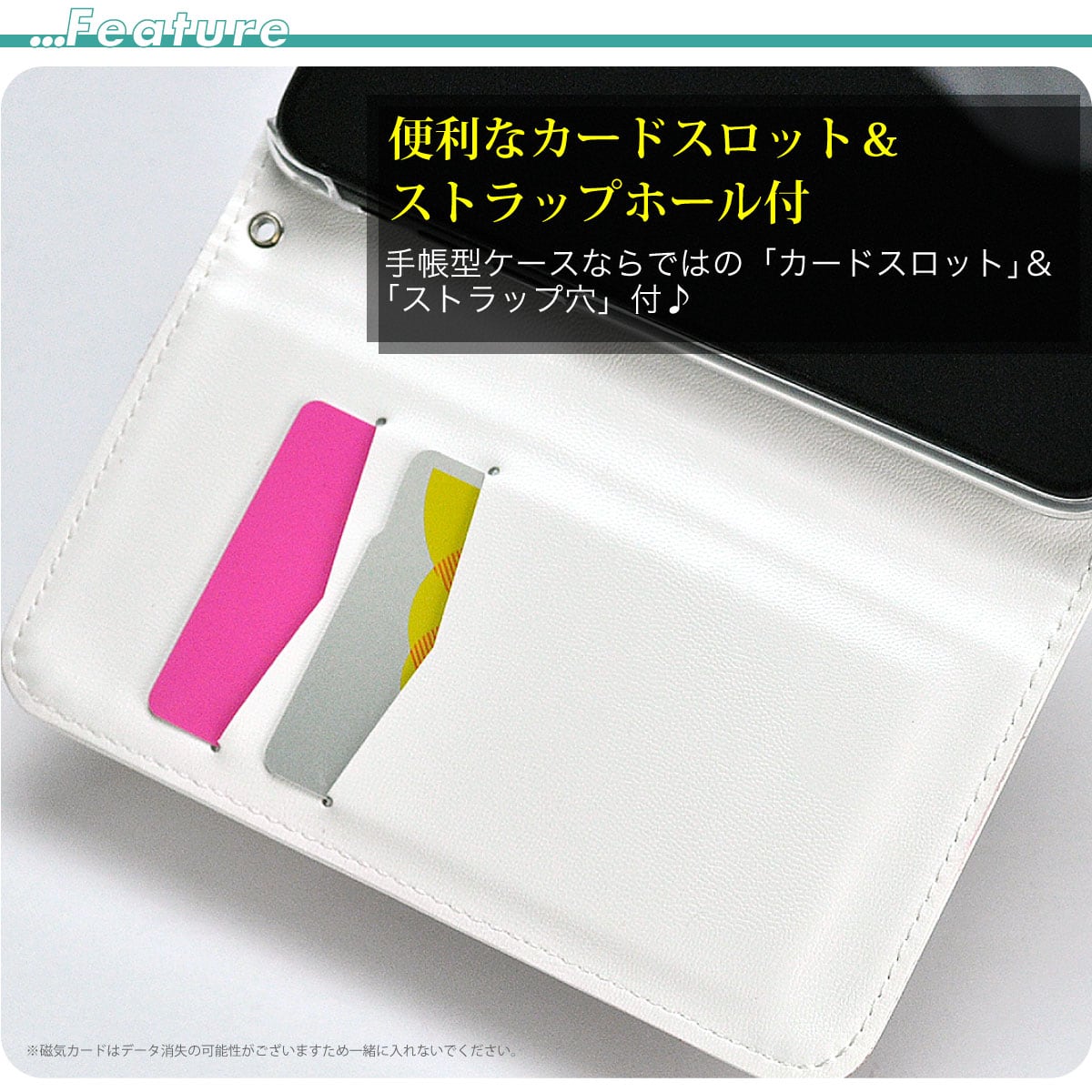 ・手帳型ケースなので、普段使いのICカード等を入れてスマートにお使いいただけます。※磁力に弱いカードは入れないで下さい。