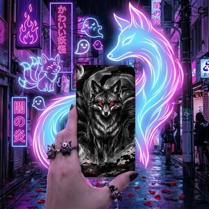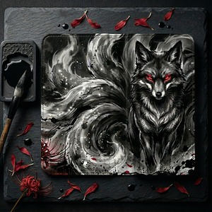Make a powerful statement with this breathtaking dark fantasy design. It features the fierce silhouette of the legendary Nine-Tailed Fox (Kitsune), brought to life through explosive Sumi-e (ink wash) brushstrokes against a pitch-black background. The piercing golden eyes and the vibrant red Spider Lilies (Higanbana)?flowers symbolizing the afterlife in Japanese folklore?create an intoxicating blend of mythical beauty and madness. Perfect for those who crave a truly unique, edgy, and mysterious aesthetic.