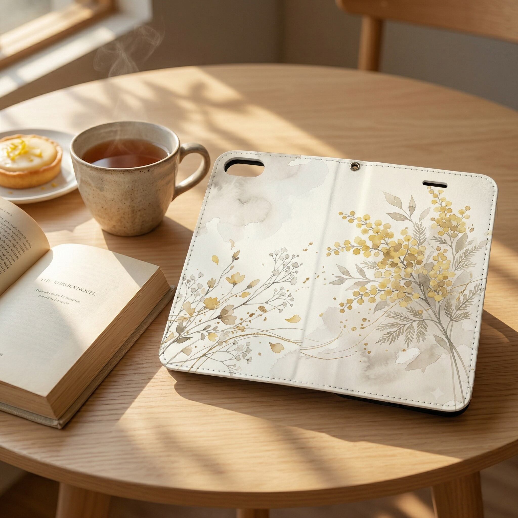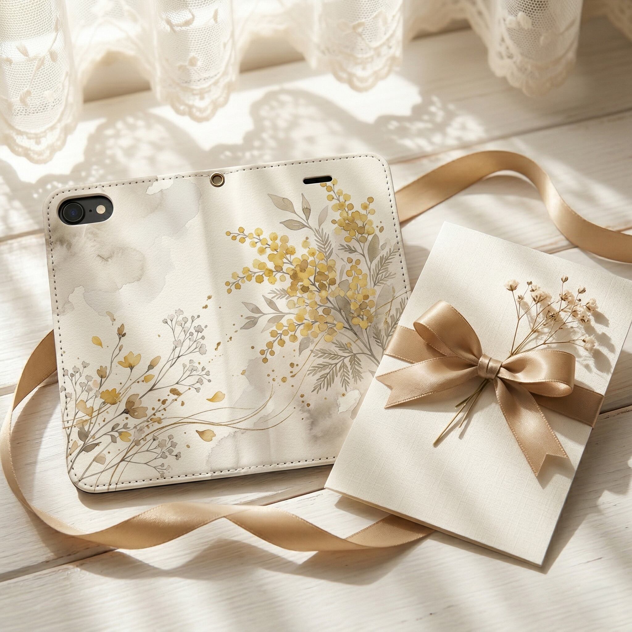 春の訪れを告げる幸福の花「ミモザ」を、透明感あふれる水彩タッチで繊細に描きました。温かみのあるくすみイエローと上品なアクセントが、大人の日常にふさわしい優雅な癒やしを届けるスマホケースです。