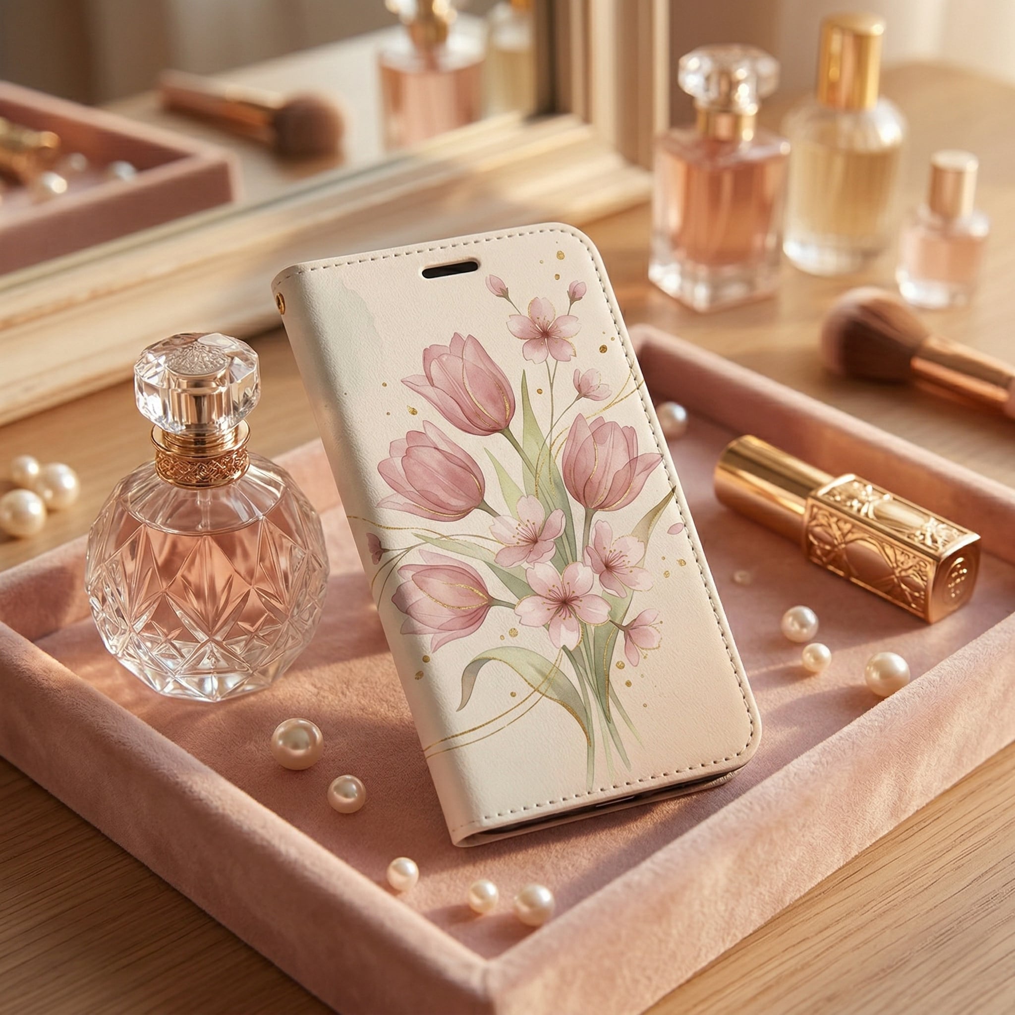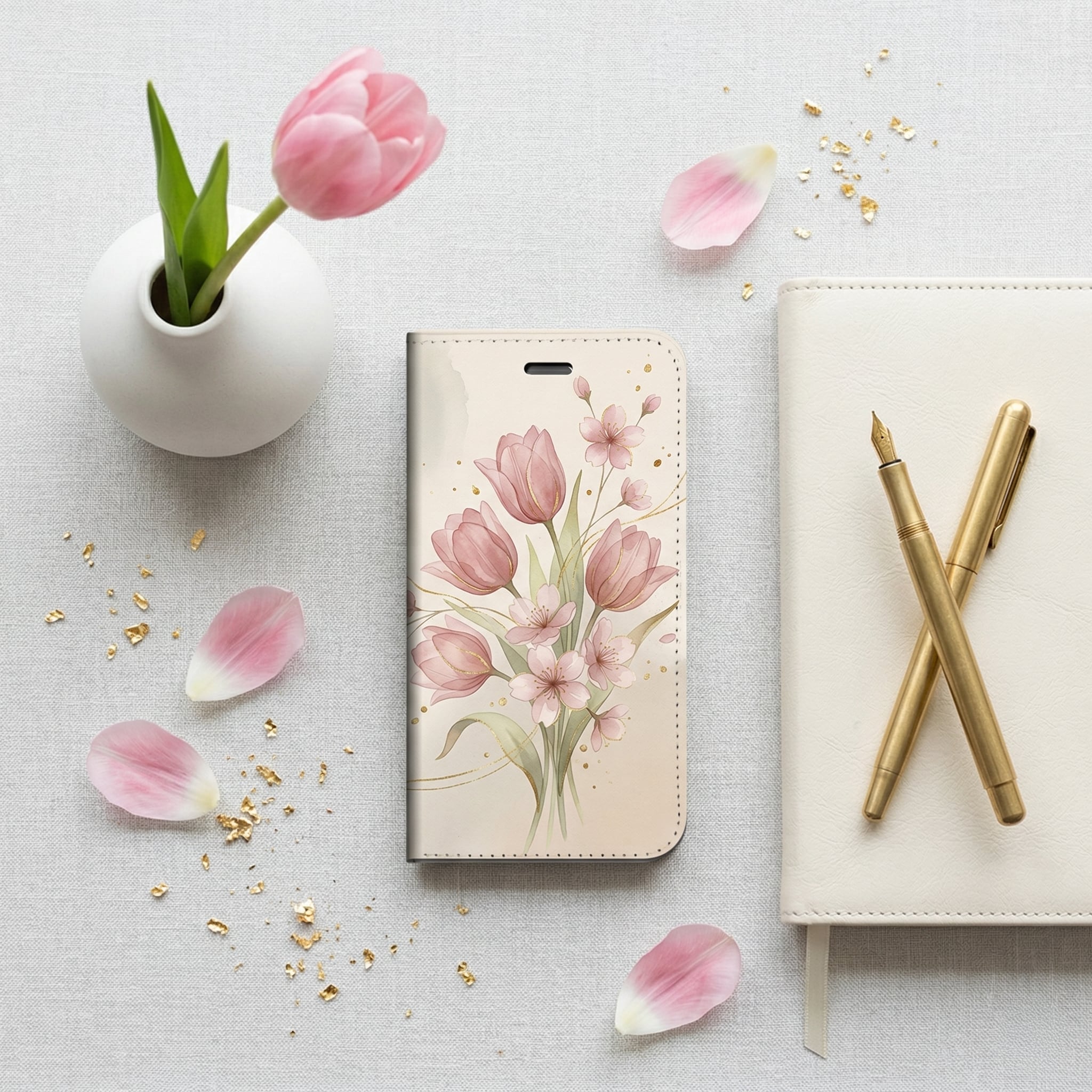 This elegant watercolor design brings together two beloved spring flowers?tulips and cherry blossoms (sakura)?in a beautifully harmonious bouquet. The soft, dusty pink tones are delicately accented with fine gold lines, creating a sophisticated and graceful aesthetic. Perfect for celebrating new beginnings or adding a touch of everyday healing to your life, this case is your personal, everlasting spring.