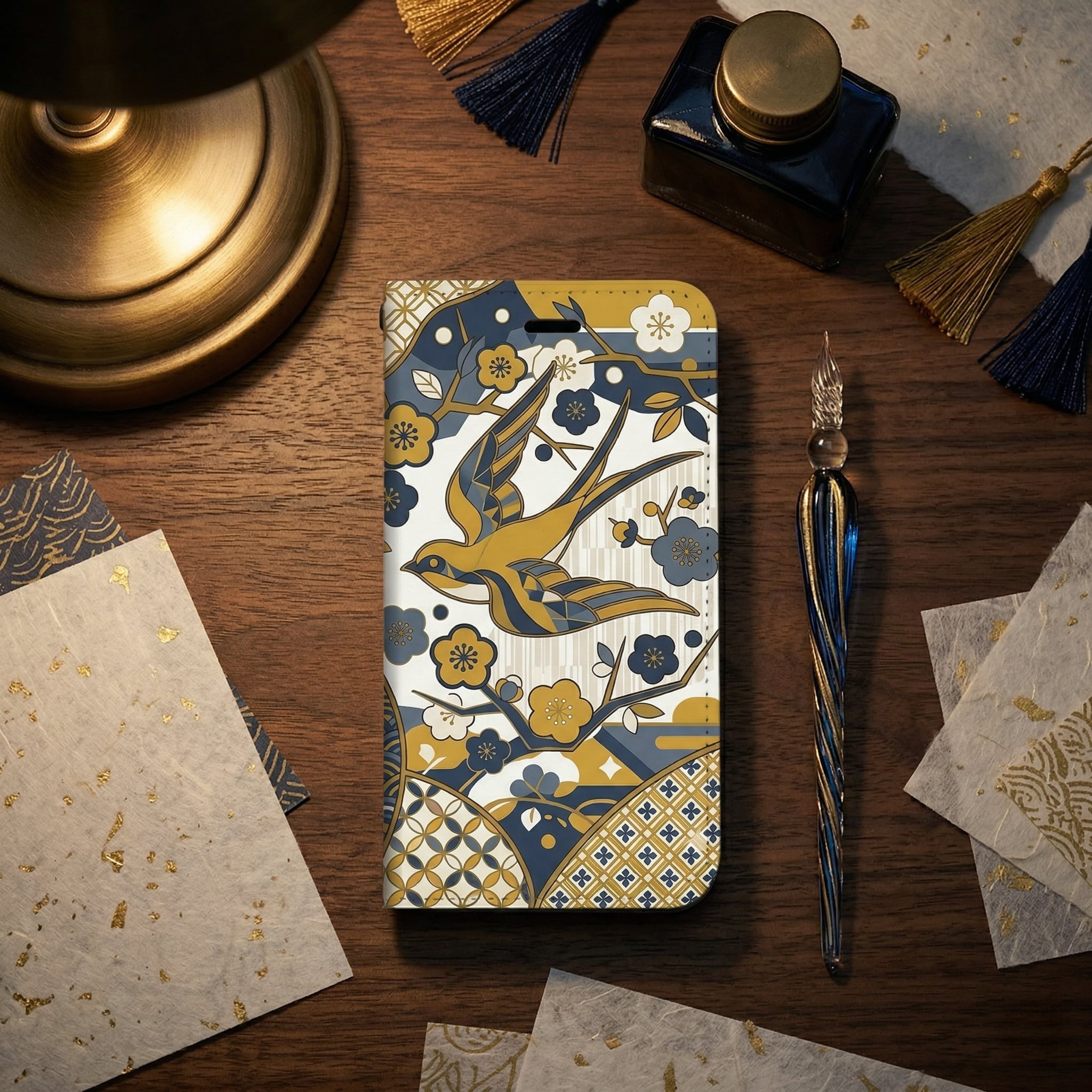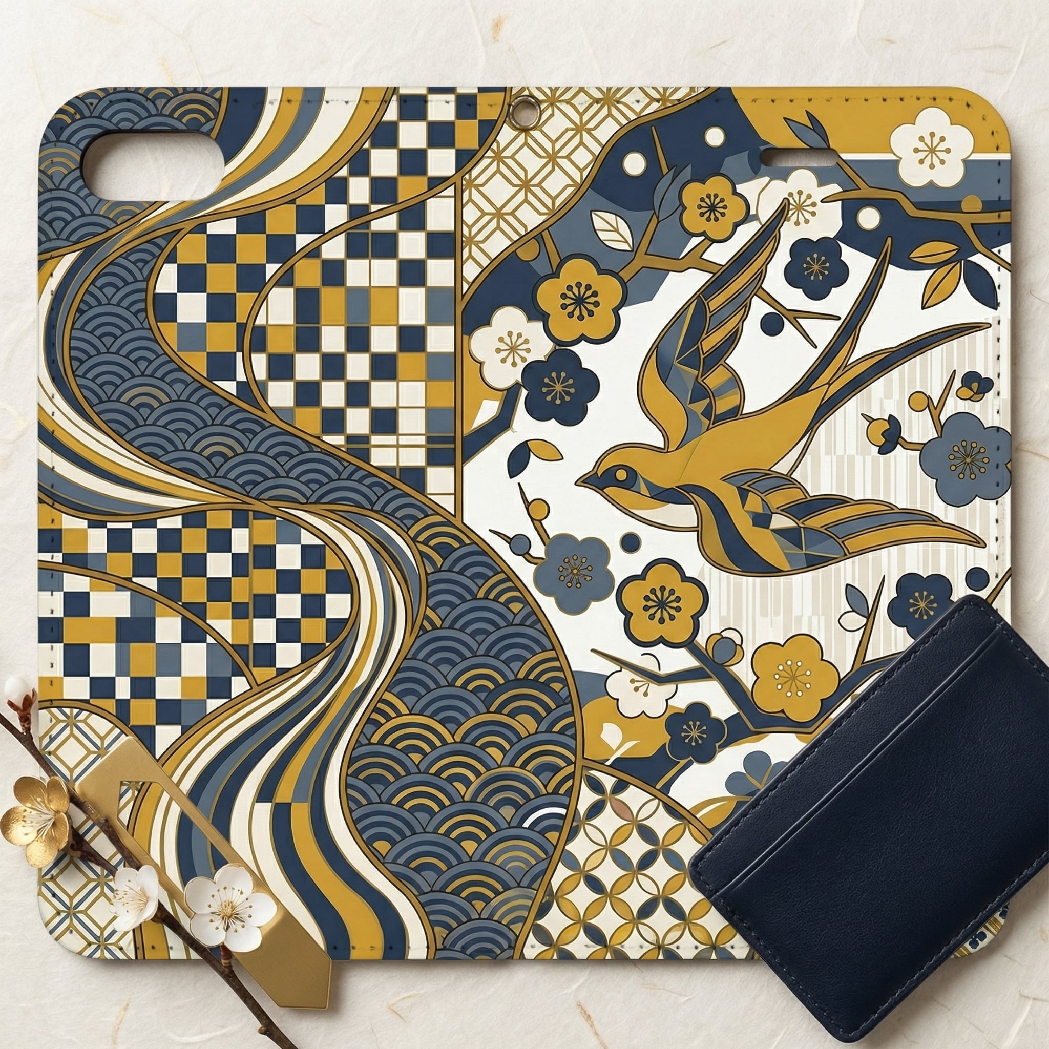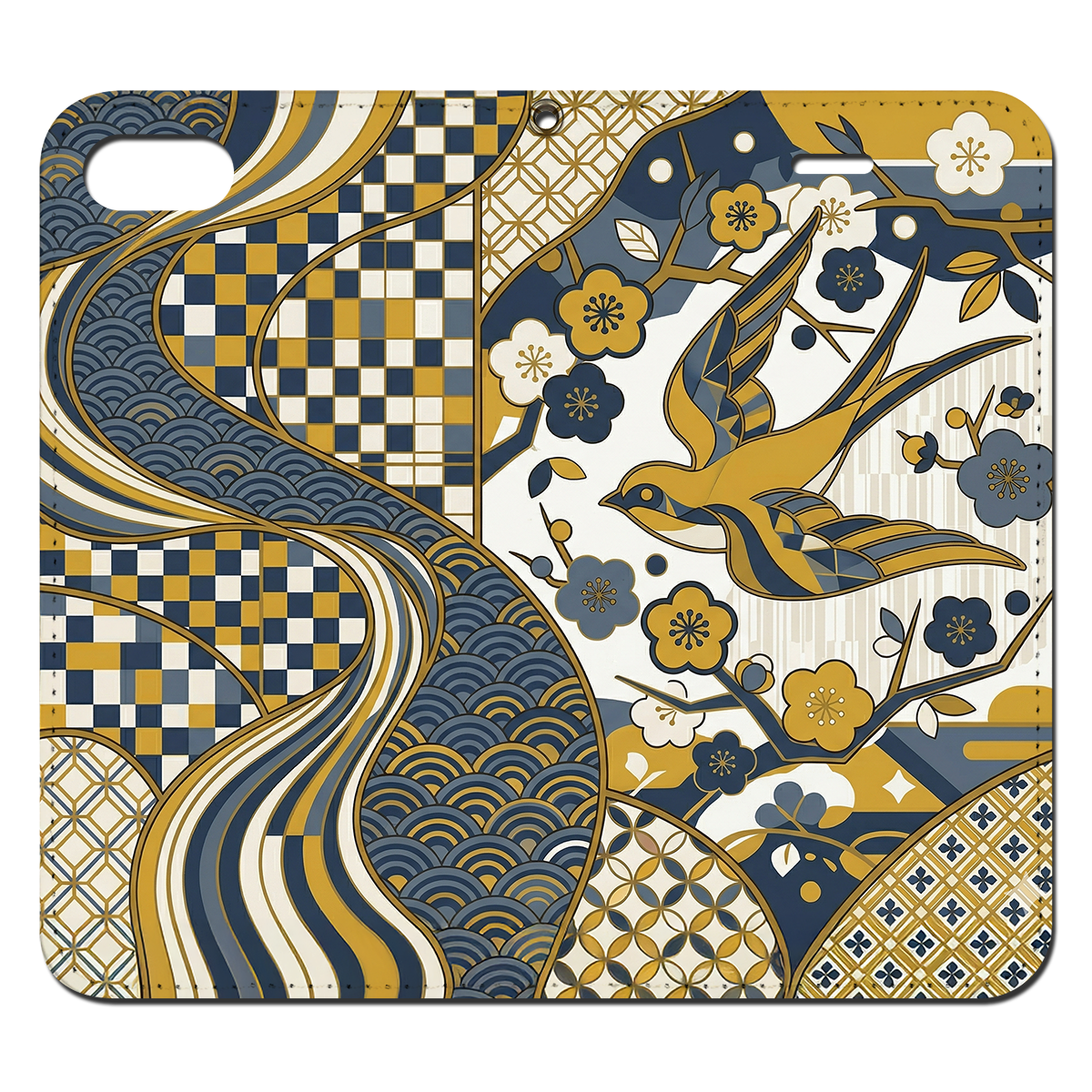 This striking design elegantly fuses traditional Japanese motifs?such as the lucky swallow, geometric plum blossoms, Seigaiha (ocean waves), and Ichimatsu (checkers)?into a contemporary graphic art masterpiece. The sophisticated color palette of mustard yellow and muted navy blue adds a chic, intellectual vibe. Perfect for those who appreciate ""Iki"" (refined style), this unique case transforms your device into a piece of conversational art that carries wishes for good fortune and peace.