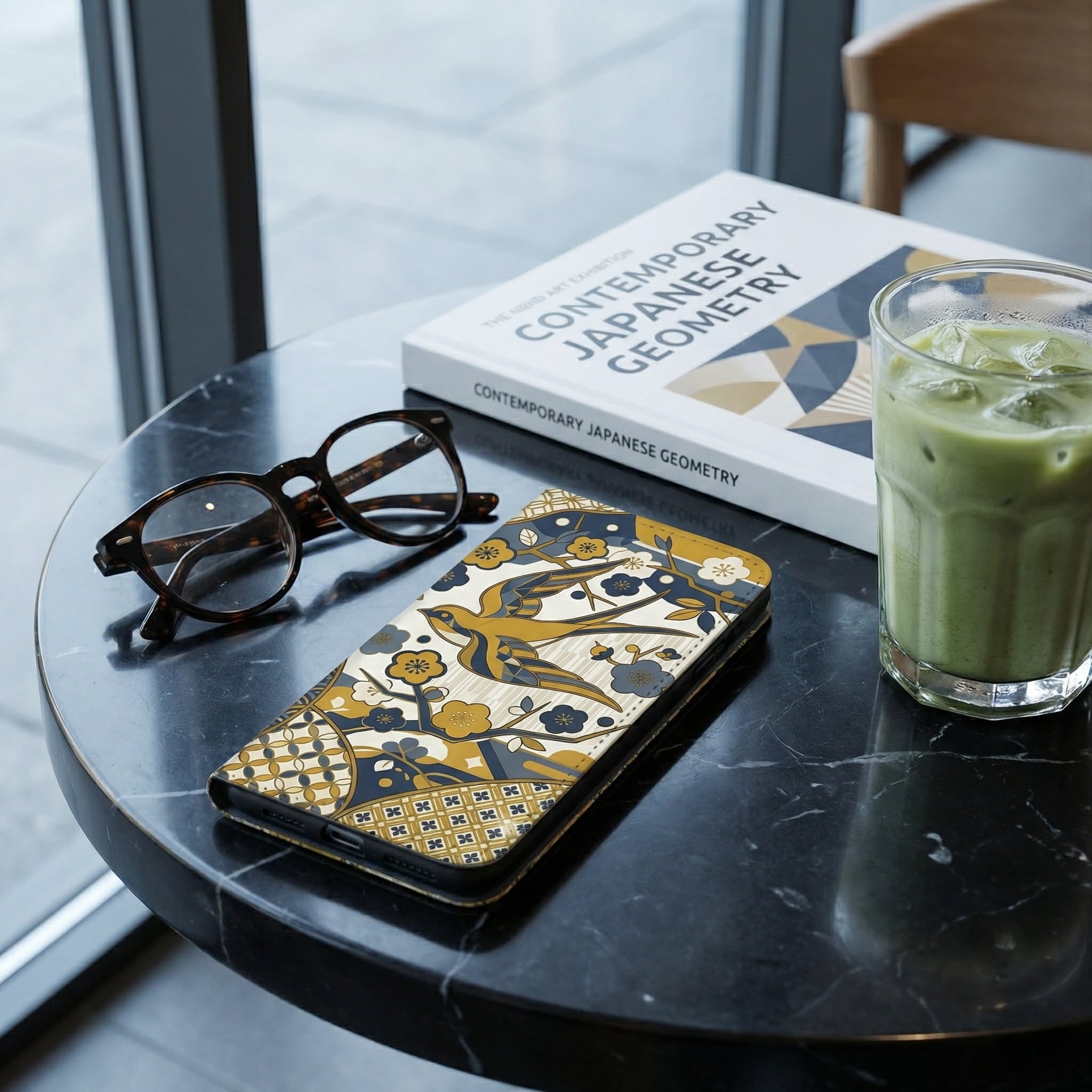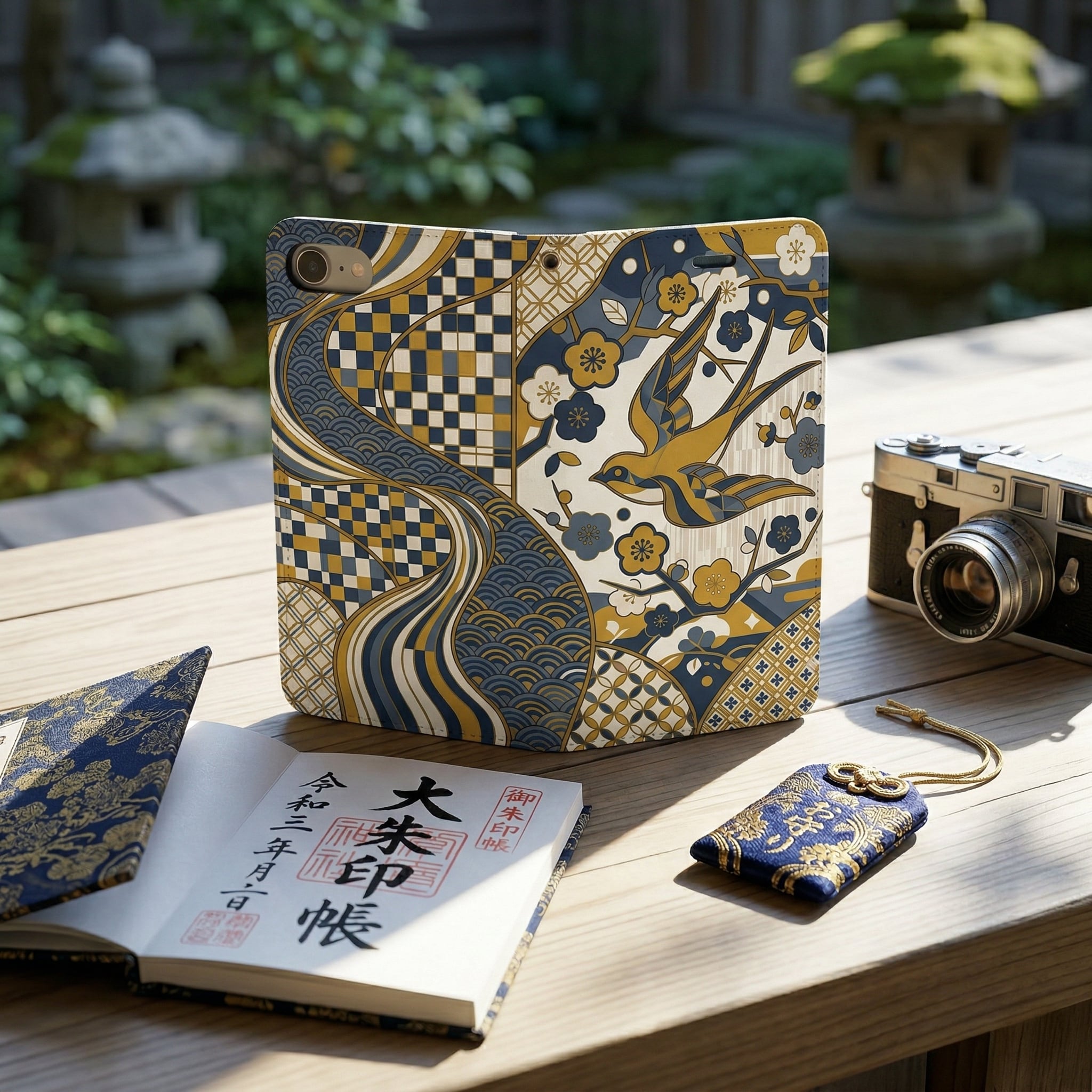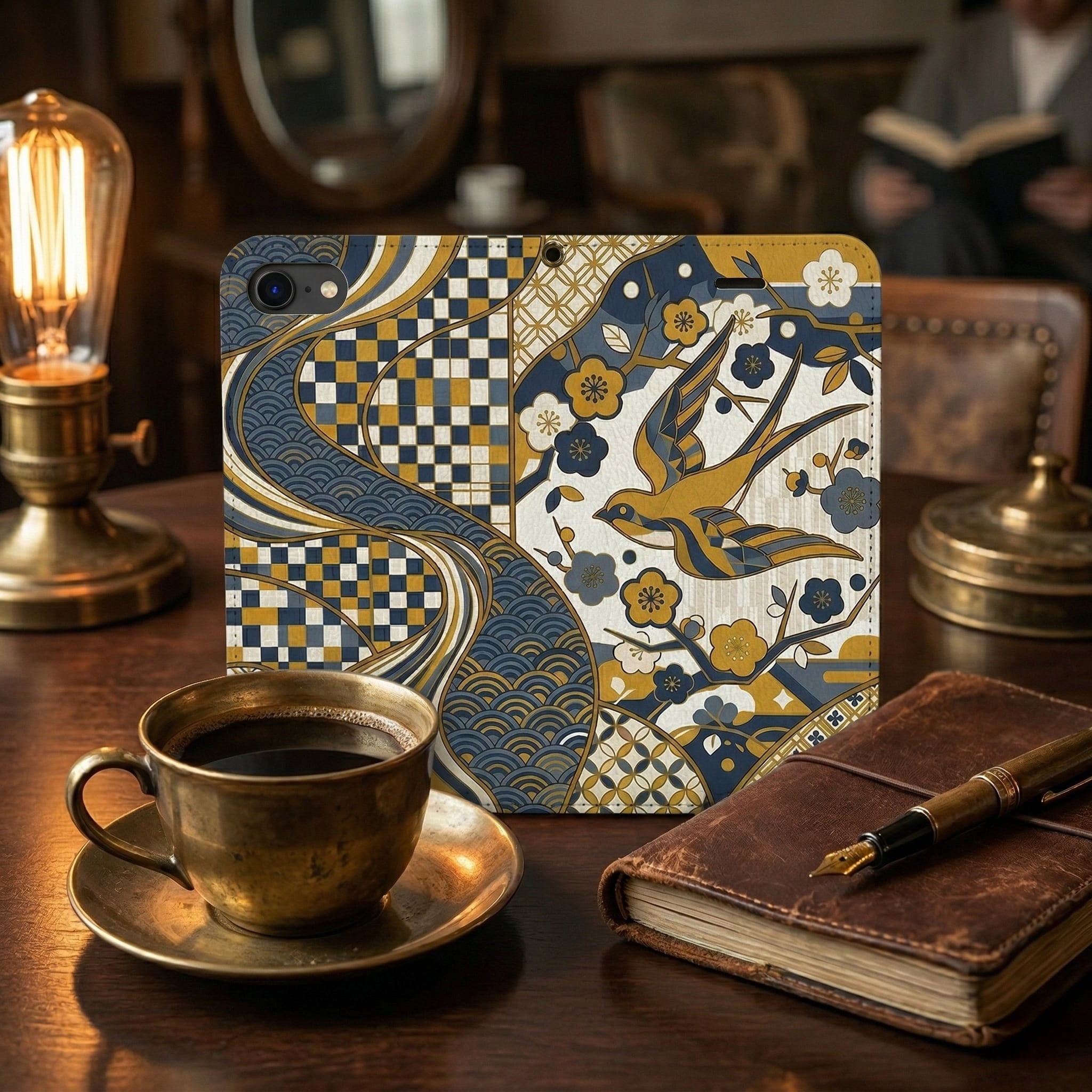 This striking design elegantly fuses traditional Japanese motifs?such as the lucky swallow, geometric plum blossoms, Seigaiha (ocean waves), and Ichimatsu (checkers)?into a contemporary graphic art masterpiece. The sophisticated color palette of mustard yellow and muted navy blue adds a chic, intellectual vibe. Perfect for those who appreciate ""Iki"" (refined style), this unique case transforms your device into a piece of conversational art that carries wishes for good fortune and peace.