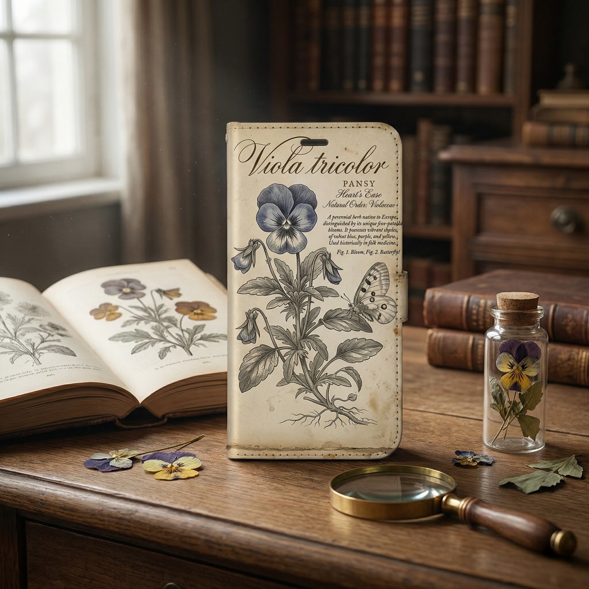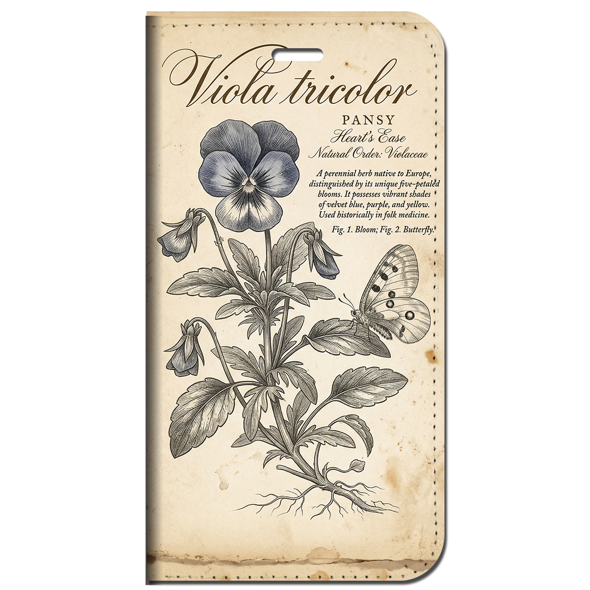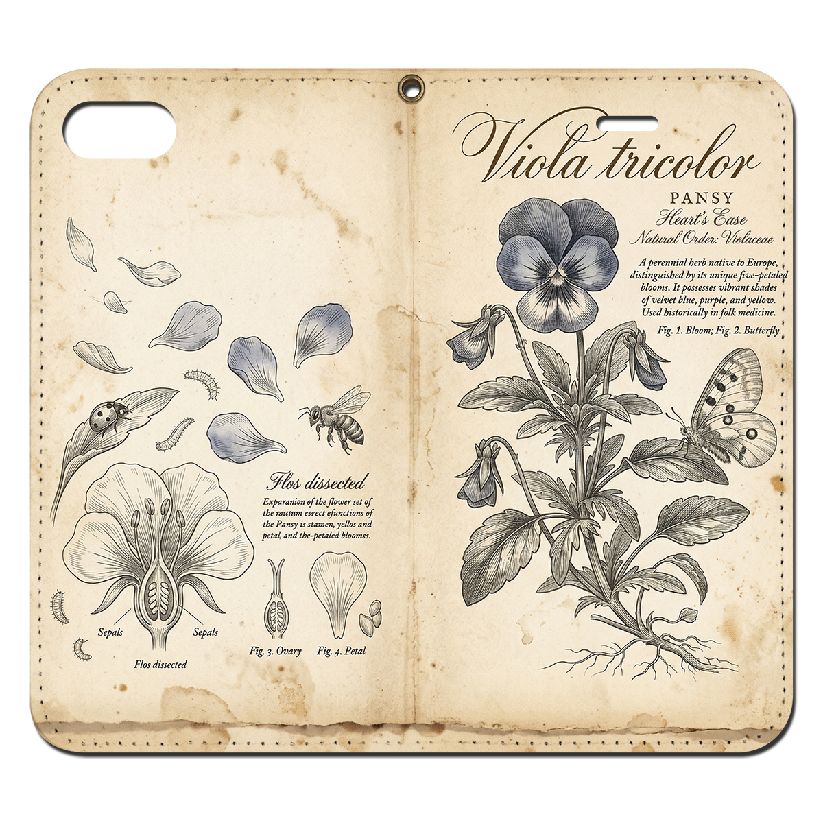#スマホケース #手帳型ケース #パンジー #博物画 #ボタニカルアート #ヴィンテージ #アンティーク #古書 #エッチング #インディゴ #植物図鑑 #ダークアカデミア #レトロ #知性的 #大人向け