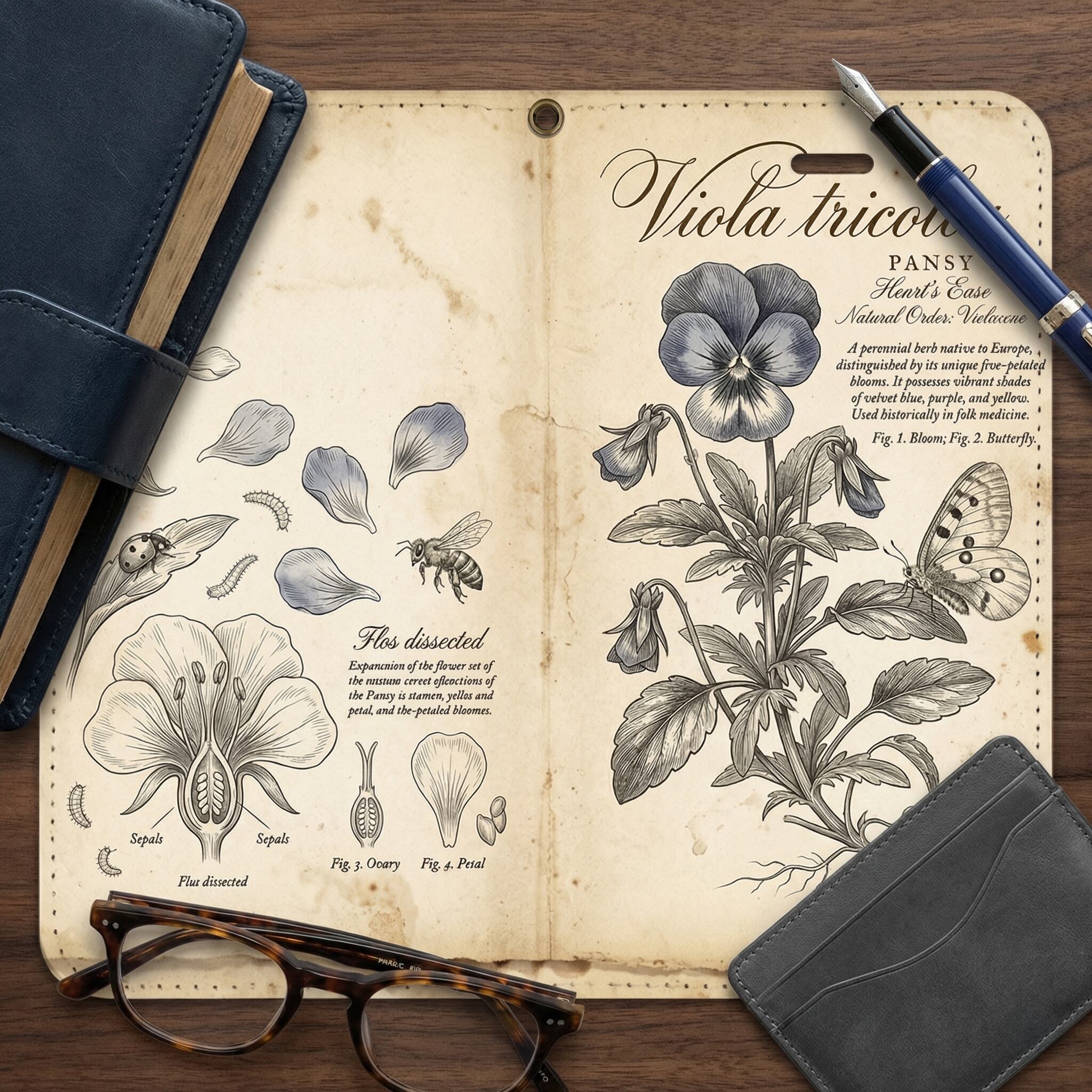 パンジー(三色スミレ)を緻密な線画とフェードインディゴの色彩で描いた、19世紀の博物画風デザインです。花の構造を記した解剖図や古びた紙の質感が、知的好奇心を満たし、日常に深い安らぎと格式を与えます。