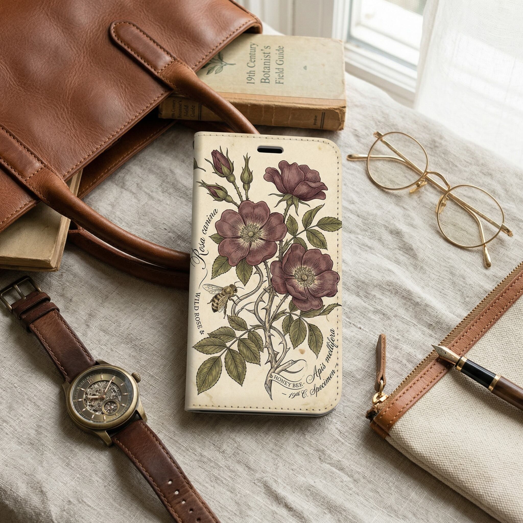 19世紀の博物図譜を再現した、野バラとミツバチの手彩色デザイン。緻密なハッチングと羊皮紙の質感が、アンティーク古書のような知的な世界観を演出します。手にするたび時を忘れる、安らぎと気品を纏う至高のケースです。
