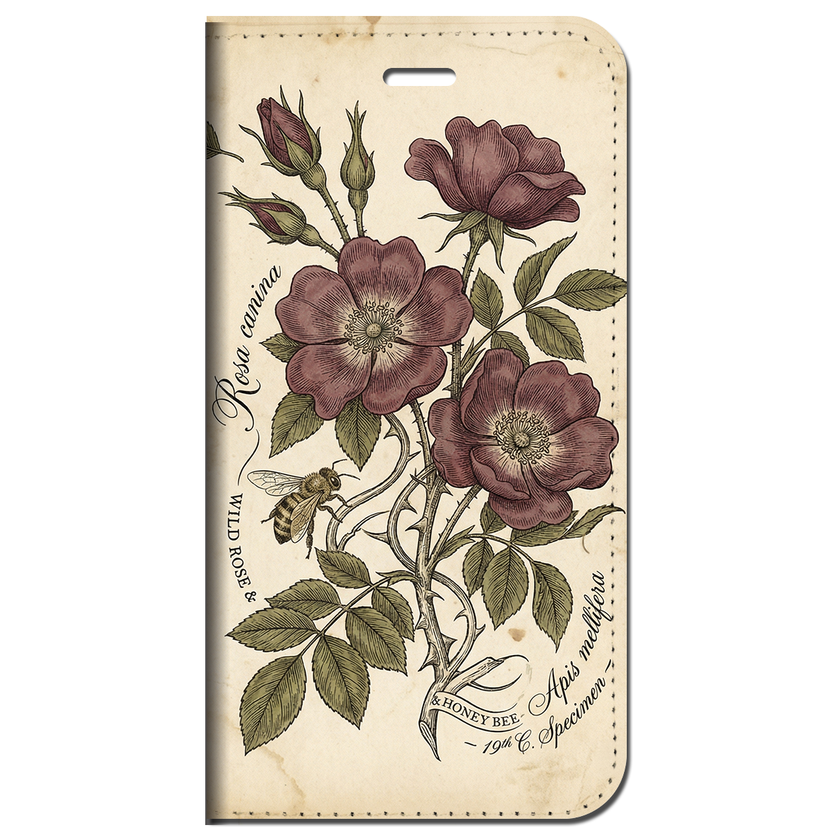 #スマホケース #手帳型ケース #野バラ #ミツバチ #アンティーク #ヴィンテージ #博物画 #ボタニカルアート #手彩色 #標本 #古書 #エッチング #ダークアカデミア #レトロ #大人向け