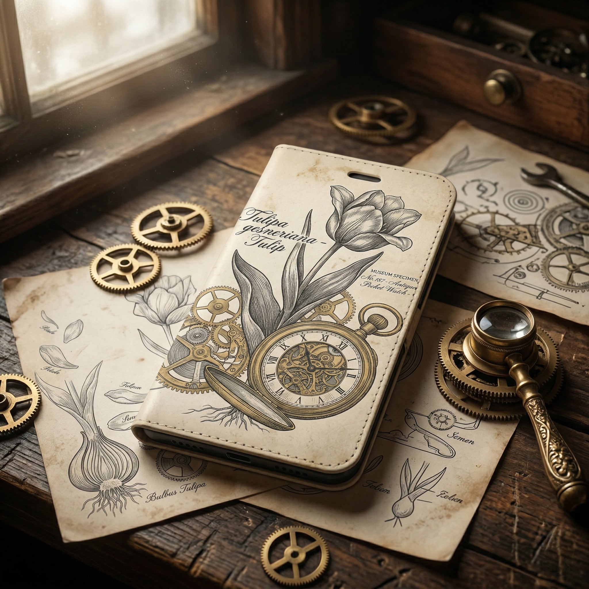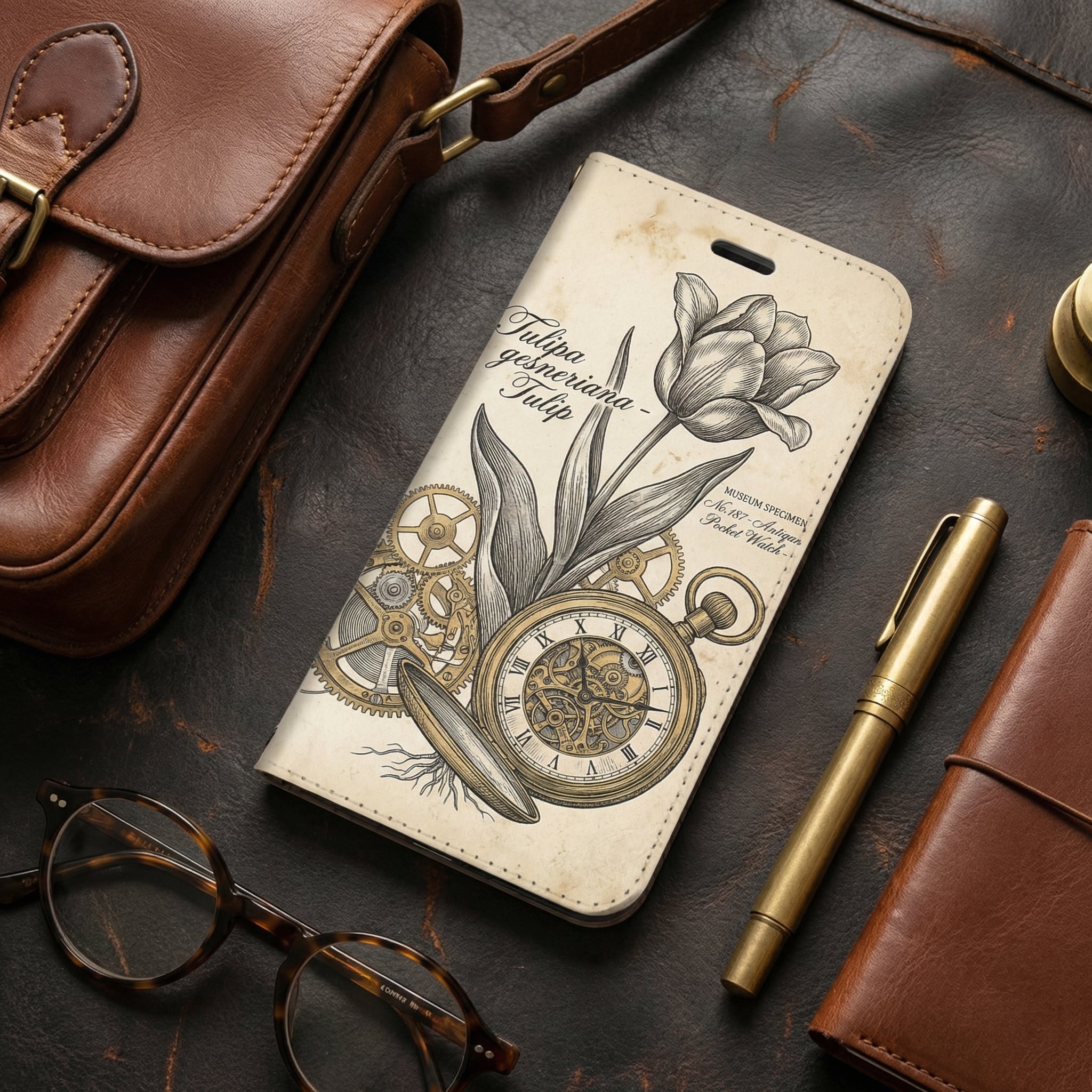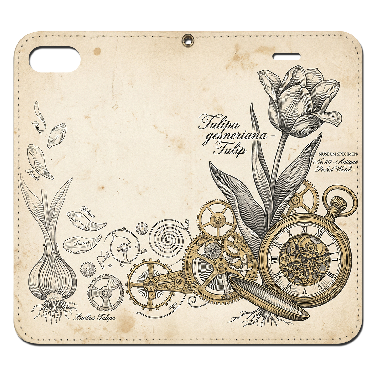 チューリップの学術図譜と精密な懐中時計の歯車を融合したヴィンテージデザイン。時の流れを感じさせる羊皮紙の質感に、チャコールとゴールド風イメージが知的に映えます。時を超えて愛される美しさを纏う至高のケースです。
