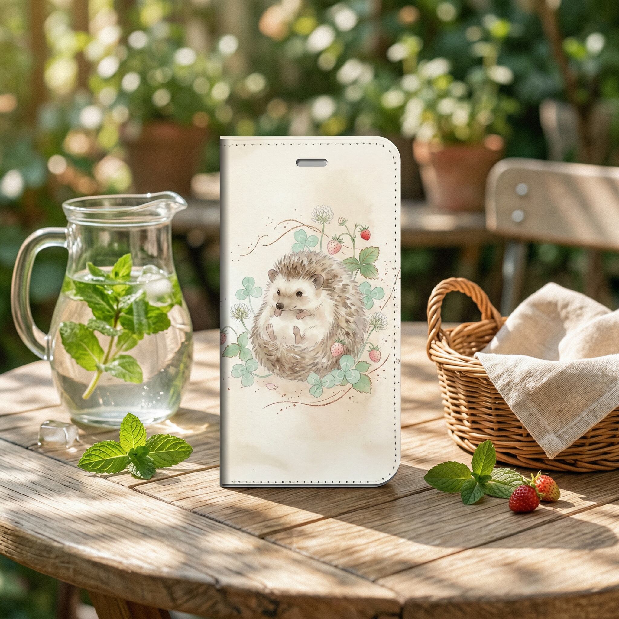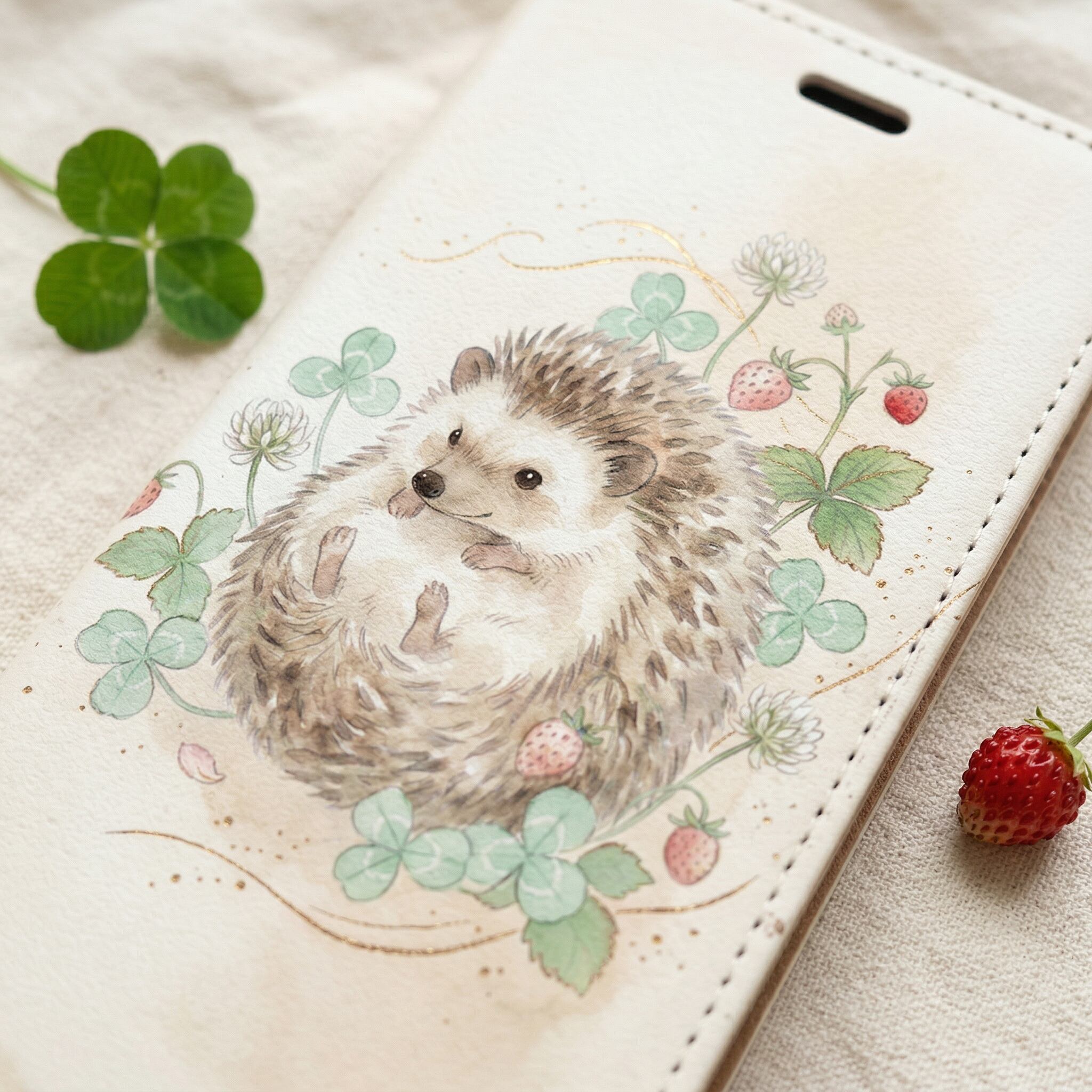 幸運を呼ぶシロツメクサに囲まれた愛らしいハリネズミを、柔らかな水彩タッチで描きました。肌馴染みの良いサンドベージュと爽やかなミントグリーンの優しい配色が、日常にほっこりとした癒やしと大人の可愛らしさを添える手帳型ケースです。