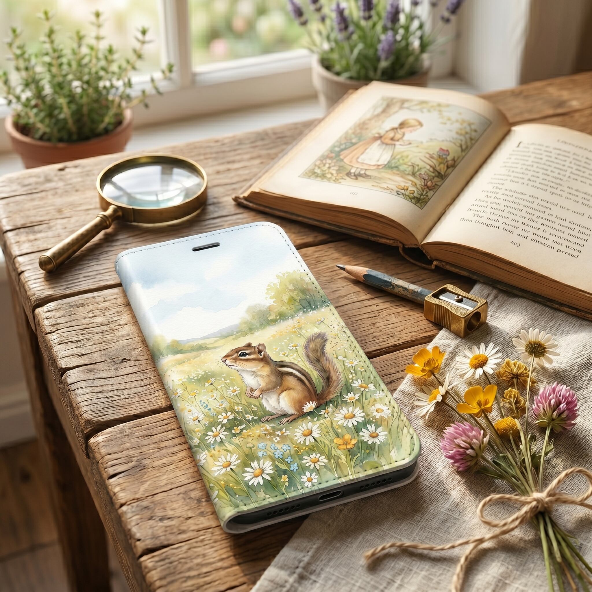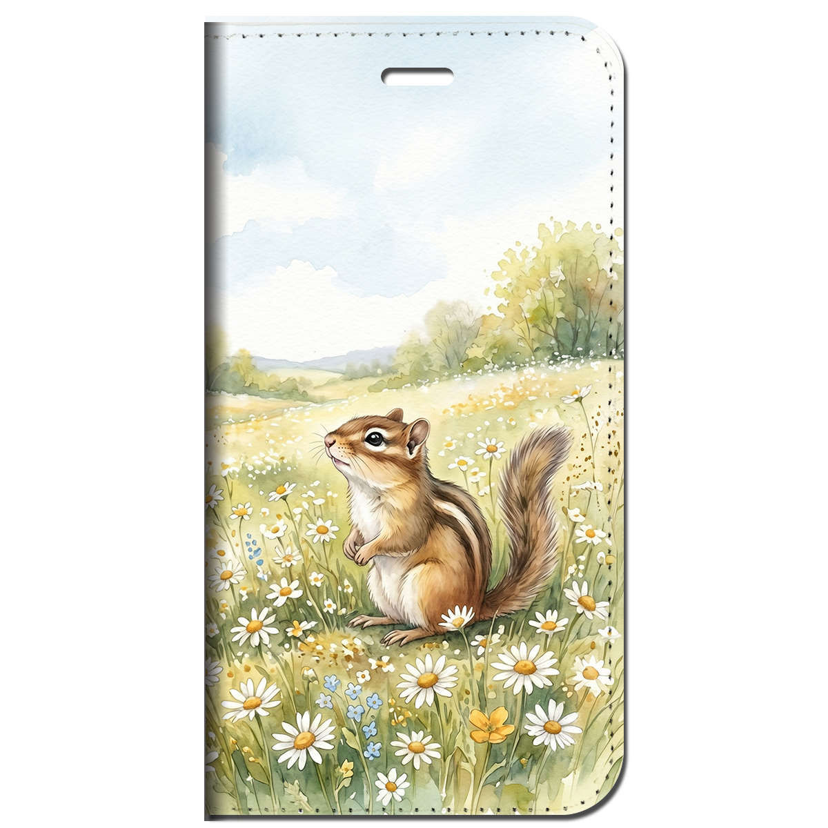 一面のデイジー畑に佇む愛らしいシマリスを、透明感あふれる水彩タッチで描きました。ペールブルーの空とマスタードイエローの爽やかな配色が、日常に絵本のような癒やしと大人の可愛らしさを添える手帳型ケースです。