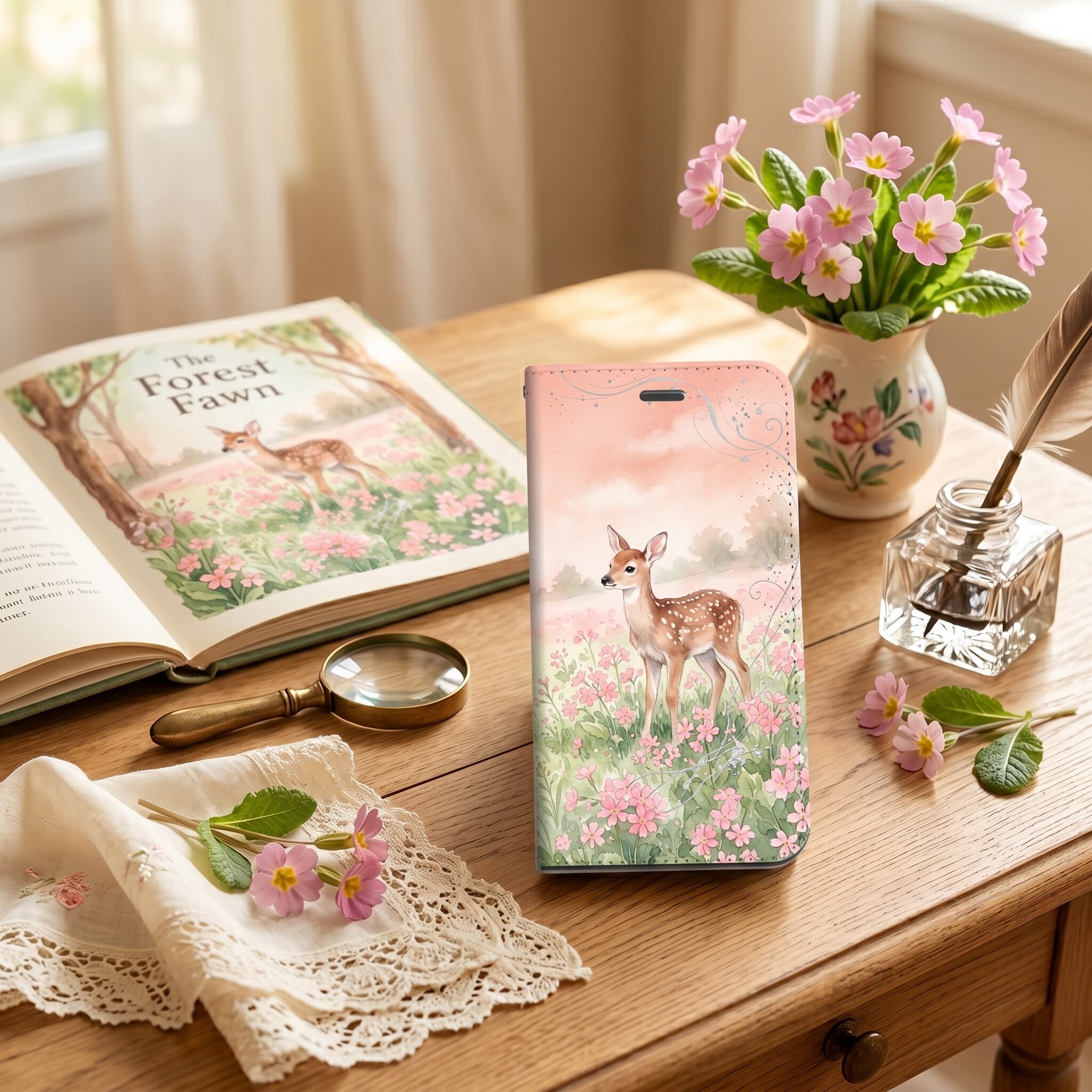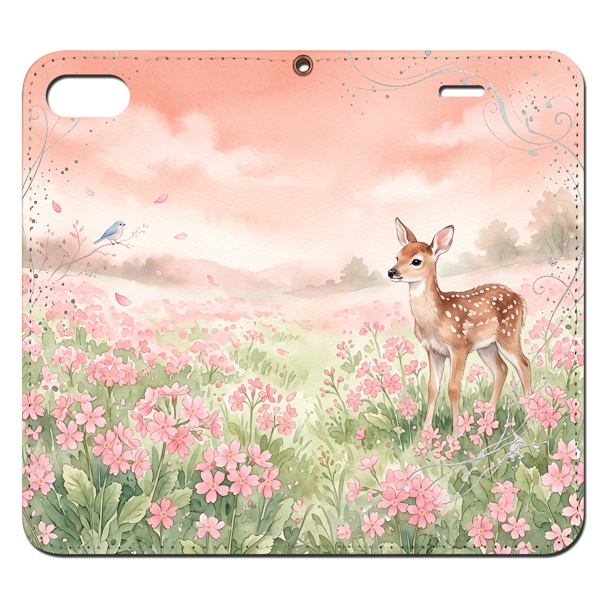 一面の桜草畑に佇む愛らしい子鹿と幸運の青い鳥を、透明感あふれる水彩タッチで描きました。コーラルピンクとスプリンググリーンの温かなくすみカラーが、日常に絵本のような癒やしと大人の可愛らしさを添える手帳型ケースです。
