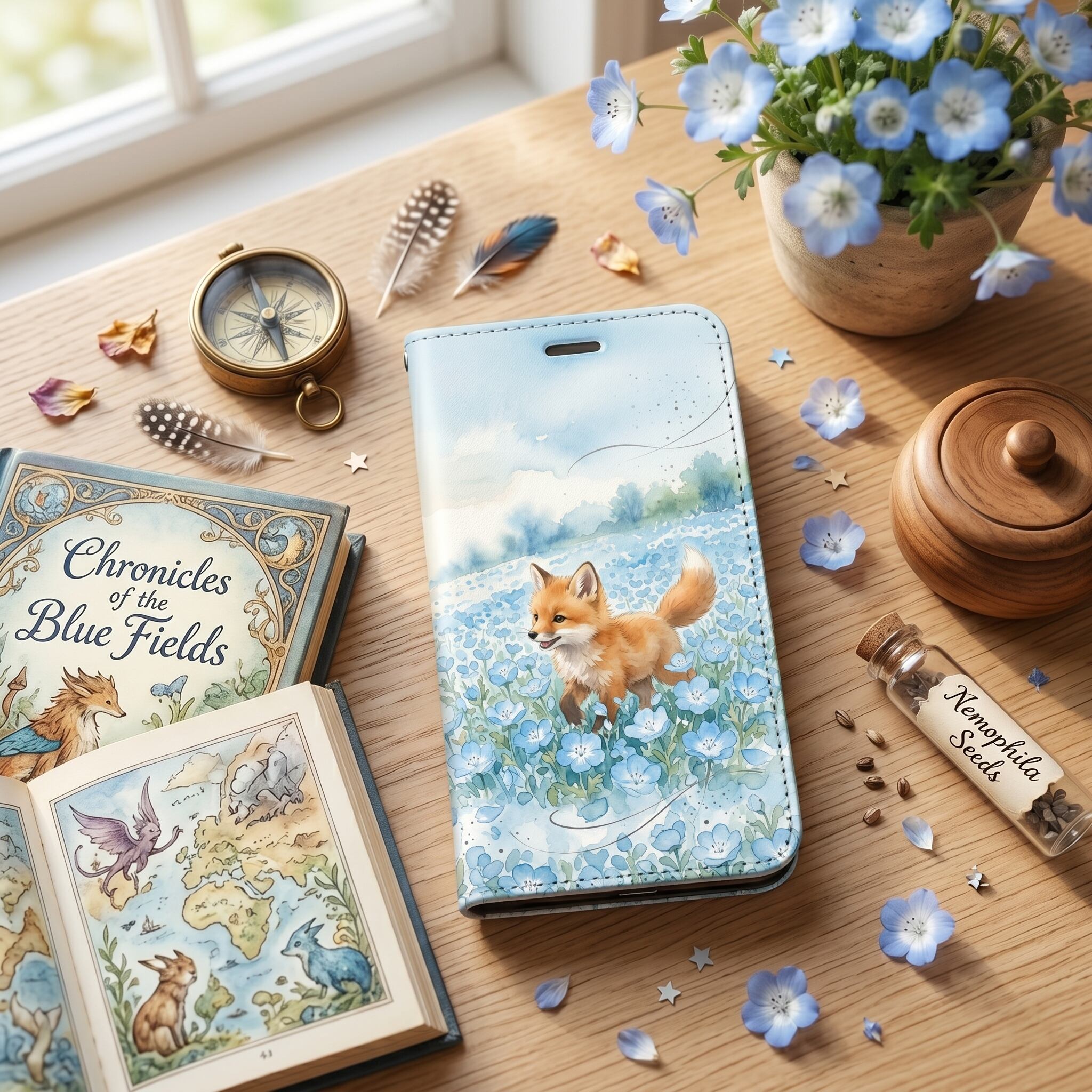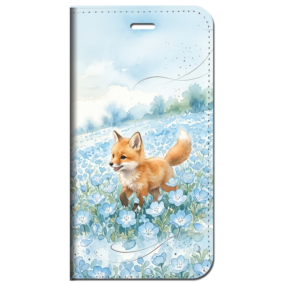 一面のネモフィラ畑で遊ぶ愛らしい子狐を、透明感あふれる水彩タッチで描きました。アイスブルーとサンドベージュの爽やかな配色が、日常に絵本のような癒やしと大人の可愛らしさを添える手帳型ケースです。