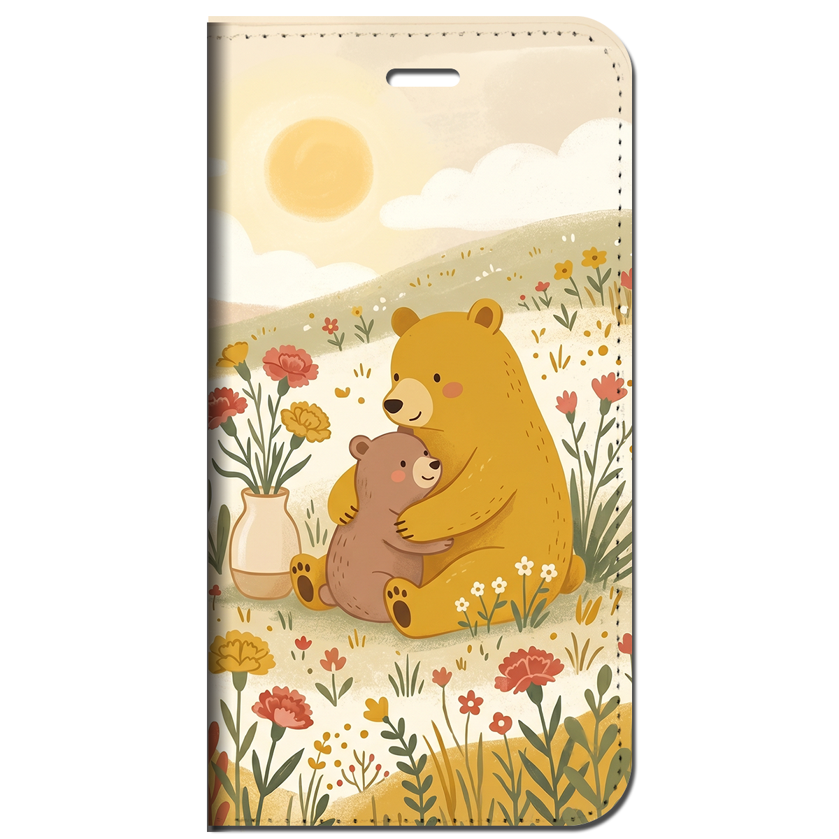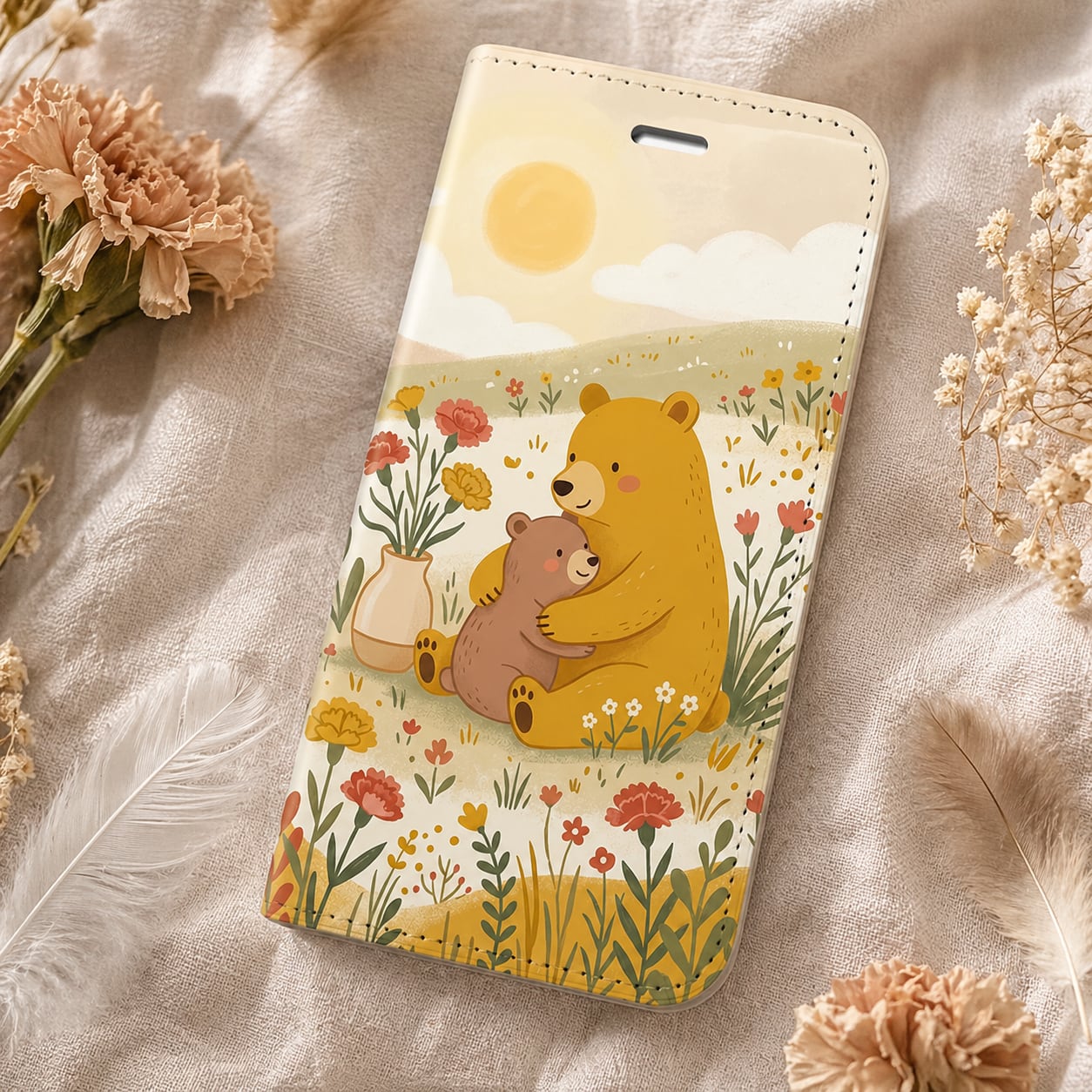 抱きしめ合うくまの親子と感謝の花を運ぶ動物たちを、優しい北欧風タッチで描きました。マスタードイエローの温かな色彩が家族の絆と癒やしを届ける、母の日の贈り物にふさわしい大人可愛い手帳型ケースです。