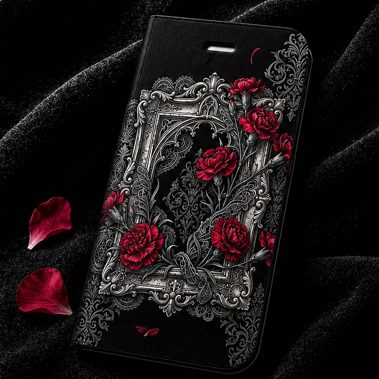 Breaking the stereotype of ""sweet and bright"" Mother's Day gifts, this design features vivid crimson carnations entwined with an intricate antique frame. Set against a deep jet-black damask pattern, it offers a powerful yet graceful tribute to mothers who embrace their own unique, cool, and mysterious style.