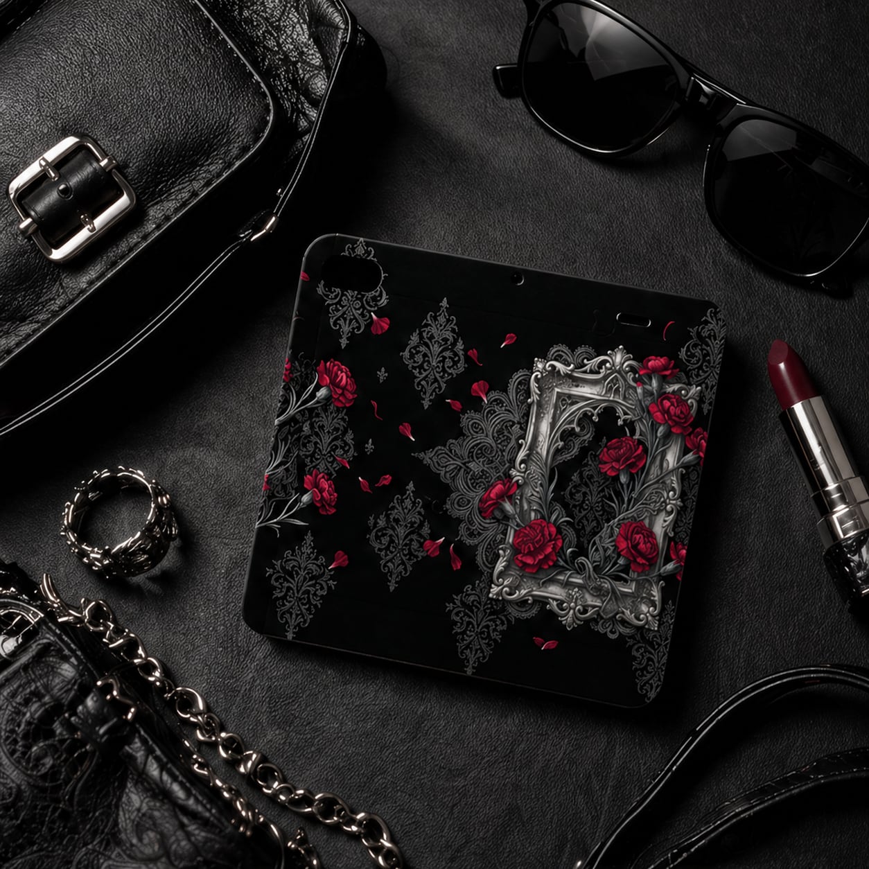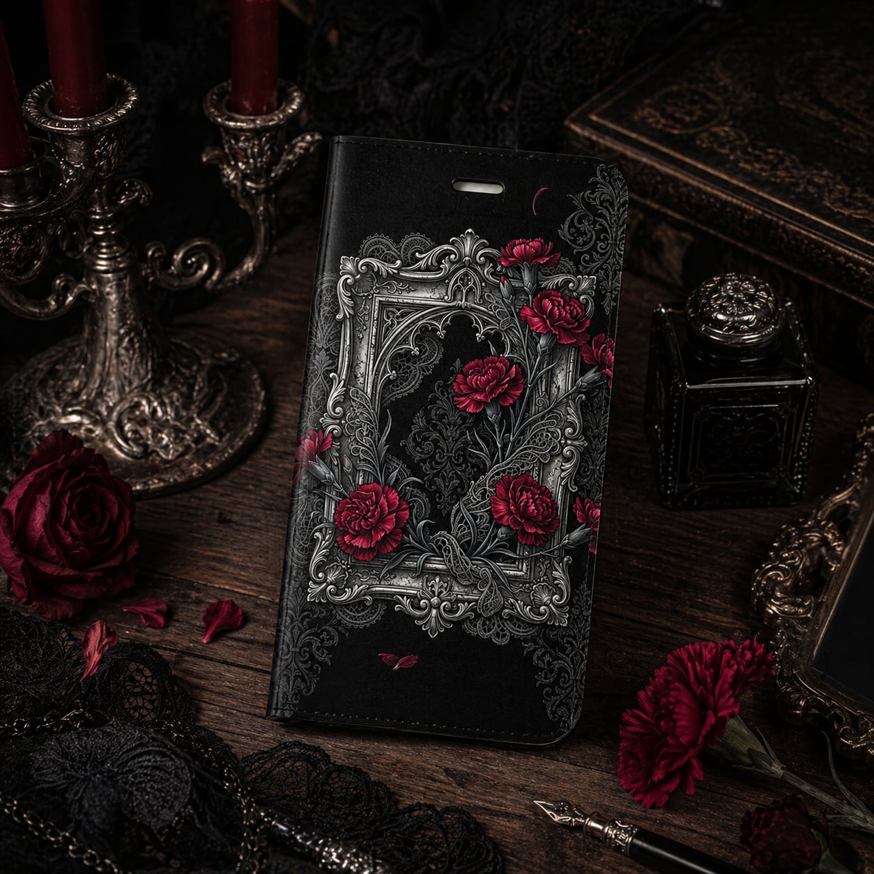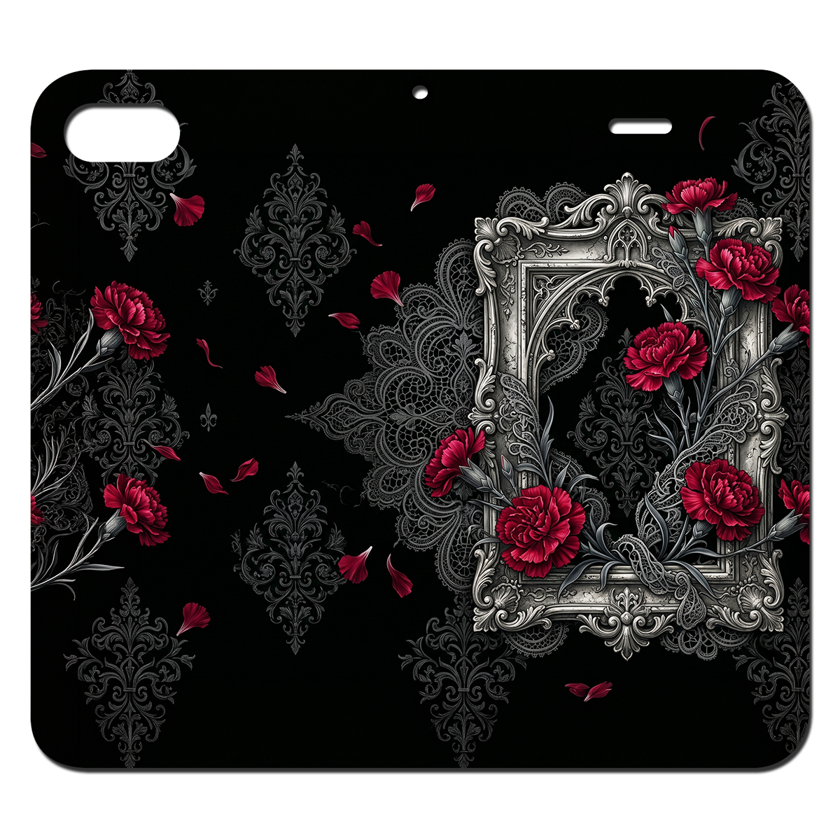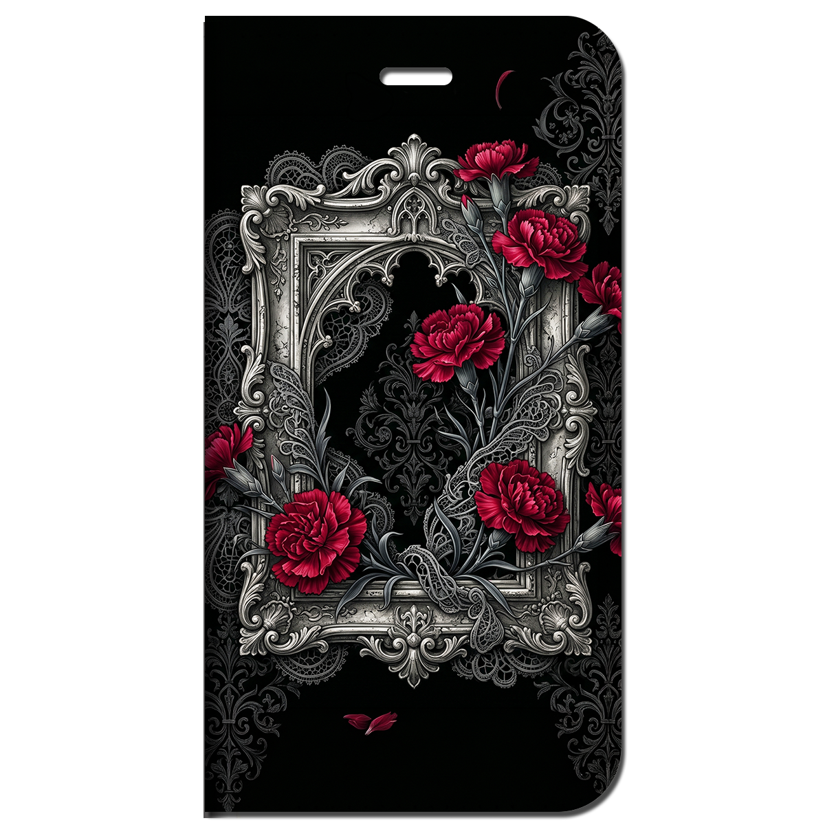 #スマホケース #手帳型ケース #母の日ギフト #カーネーション #ゴシック #ダークファンタジー #漆黒 #クリムゾンレッド #ダマスク柄 #かっこいい母 #モード系 #アンティーク #エレガント #V系 #個性的 #ギフトコレクション"