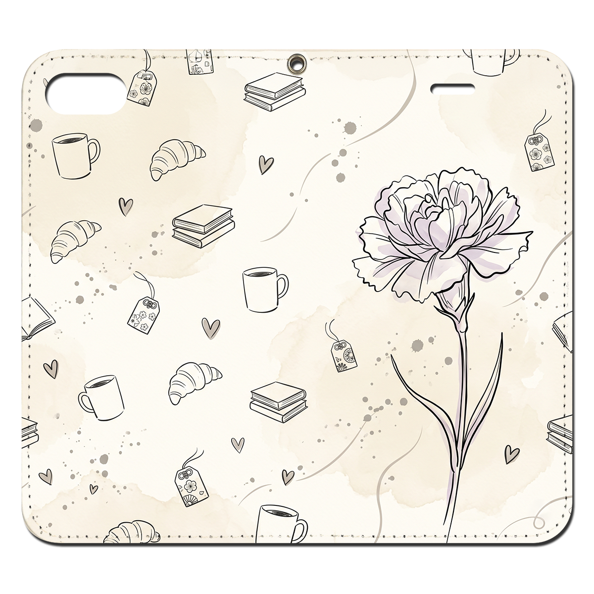 一輪のカーネーションとカフェモチーフを、トレンドの韓国風・ゆるかわ線画で描きました。アイボリーとペールパープルの優しい配色が、お母さんに「リラックスタイム」を届ける、シンプルで洗練された手帳型ケースです。