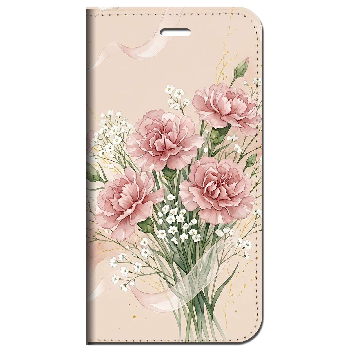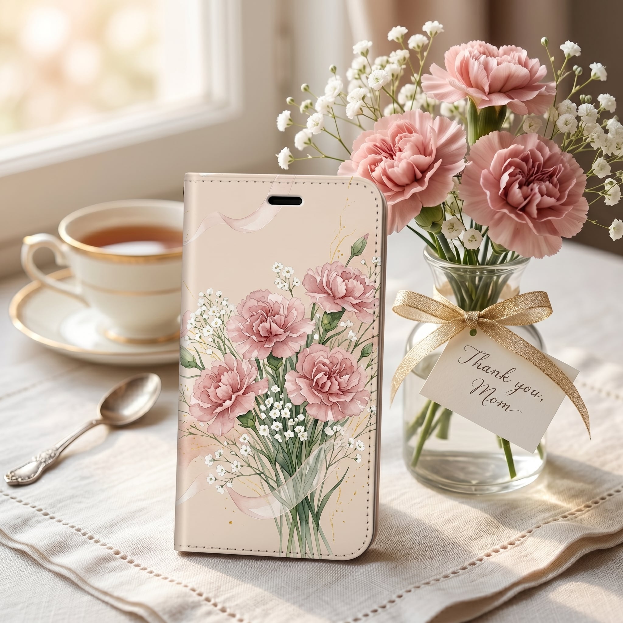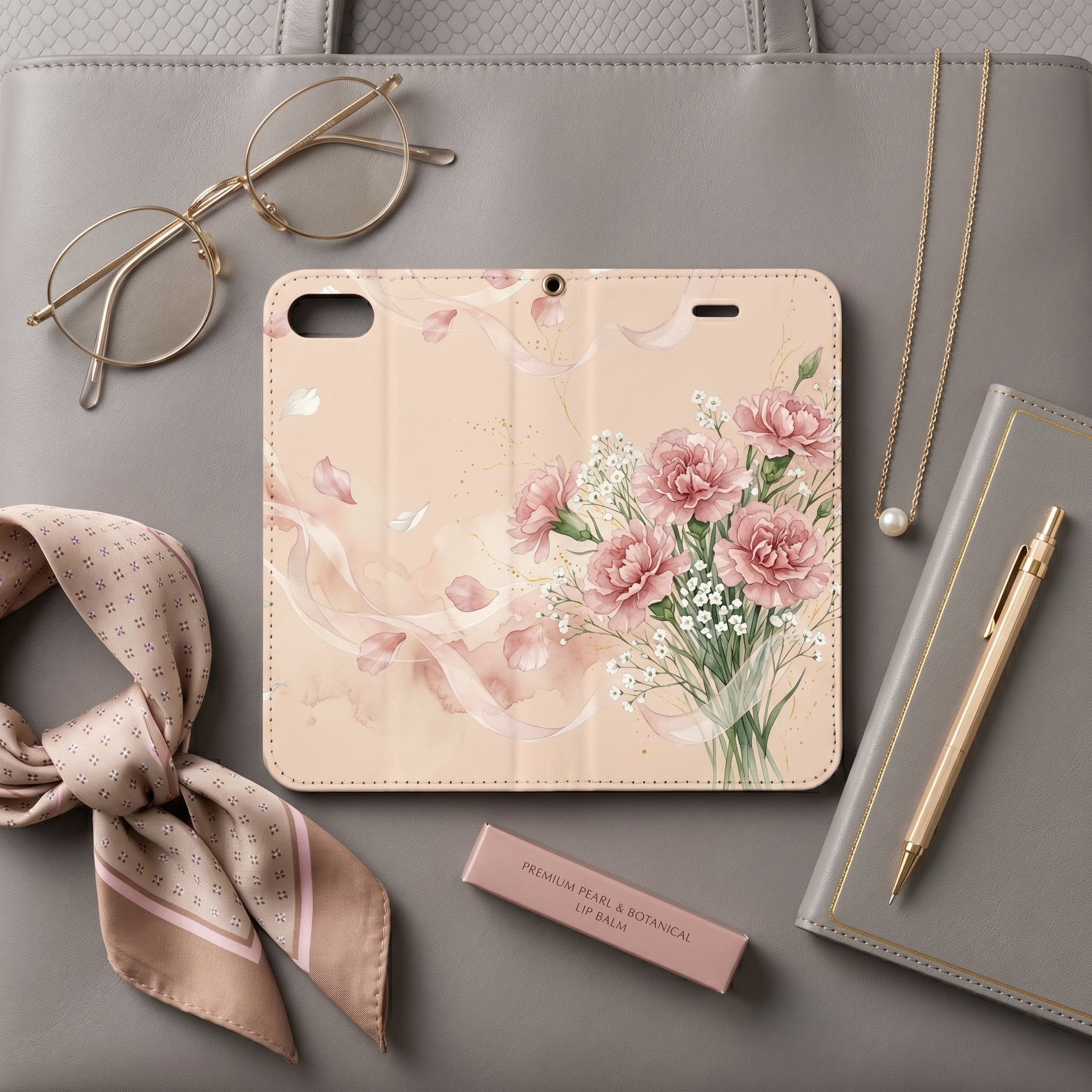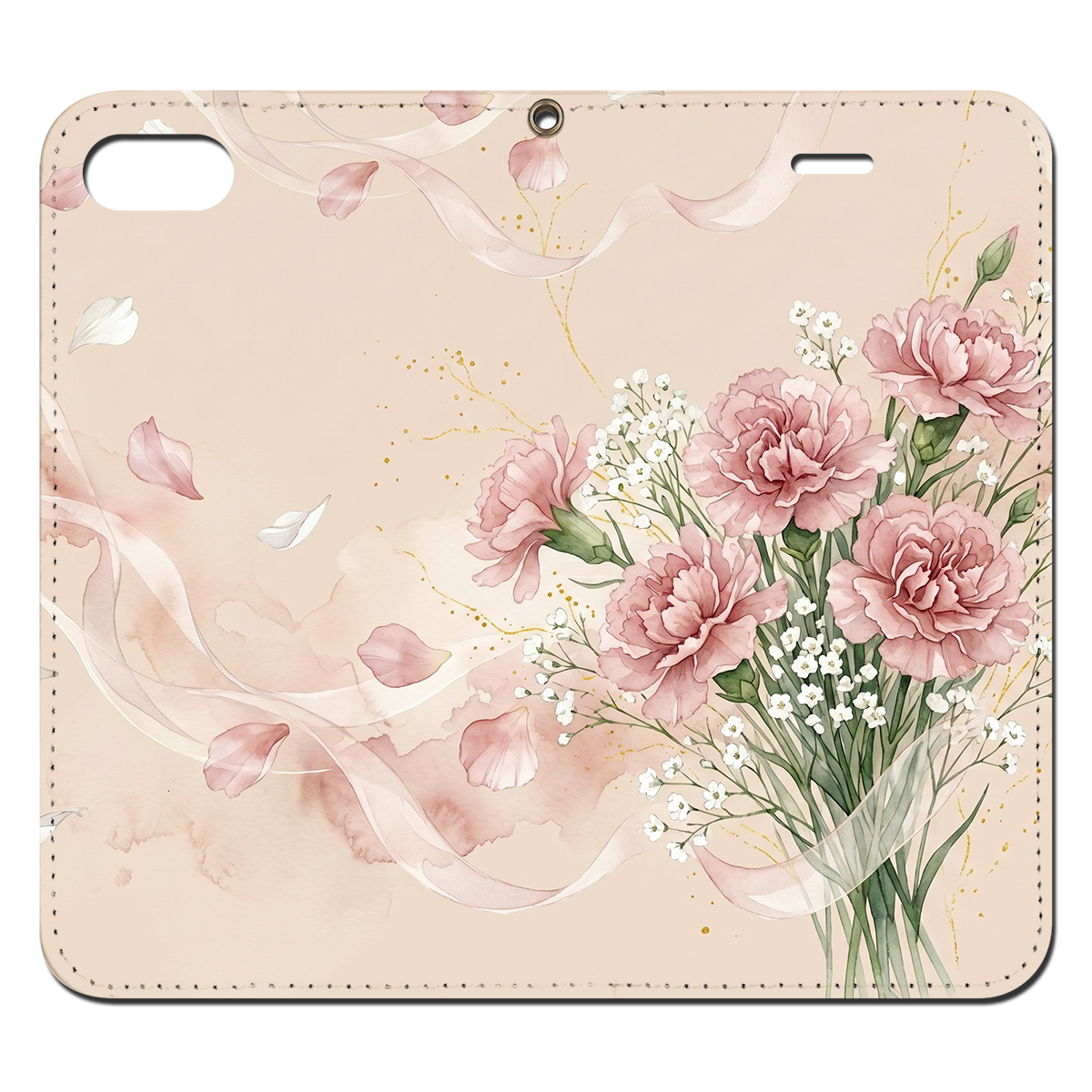 ダスティピンクのカーネーションとカスミソウの優しい水彩ブーケを、まろやかなミルクティー色で上品にまとめ上げました。感謝の気持ちを伝える母の日ギフトや自分へのご褒美にぴったりな、大人可愛い手帳型ケースです。